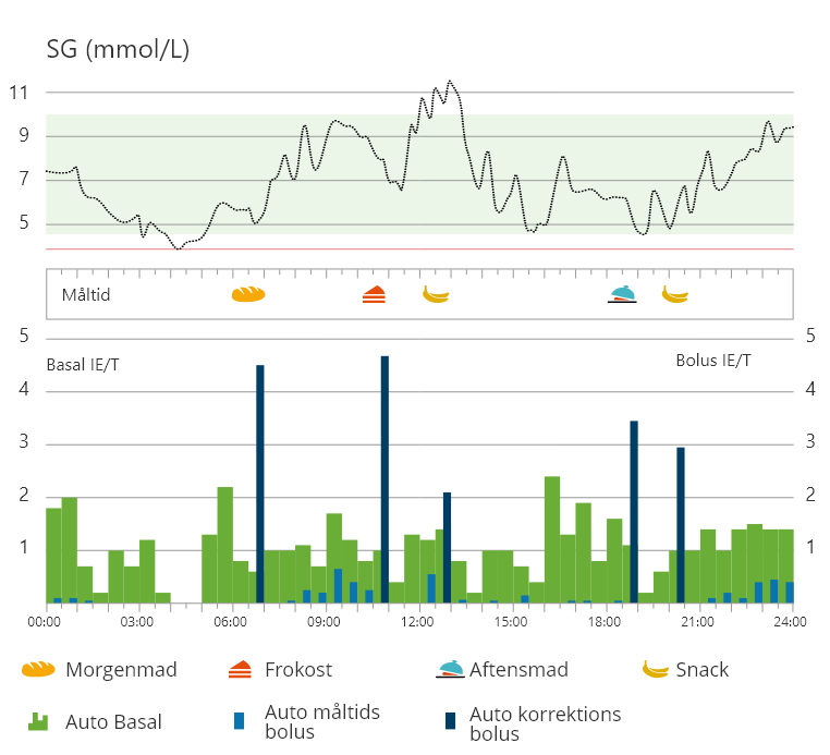 Hvis du er på vej mod et højt blodsukker, vil Auto Tilstand give dig mere insulin for at modvirke at dit blodsukker bliver højt.
